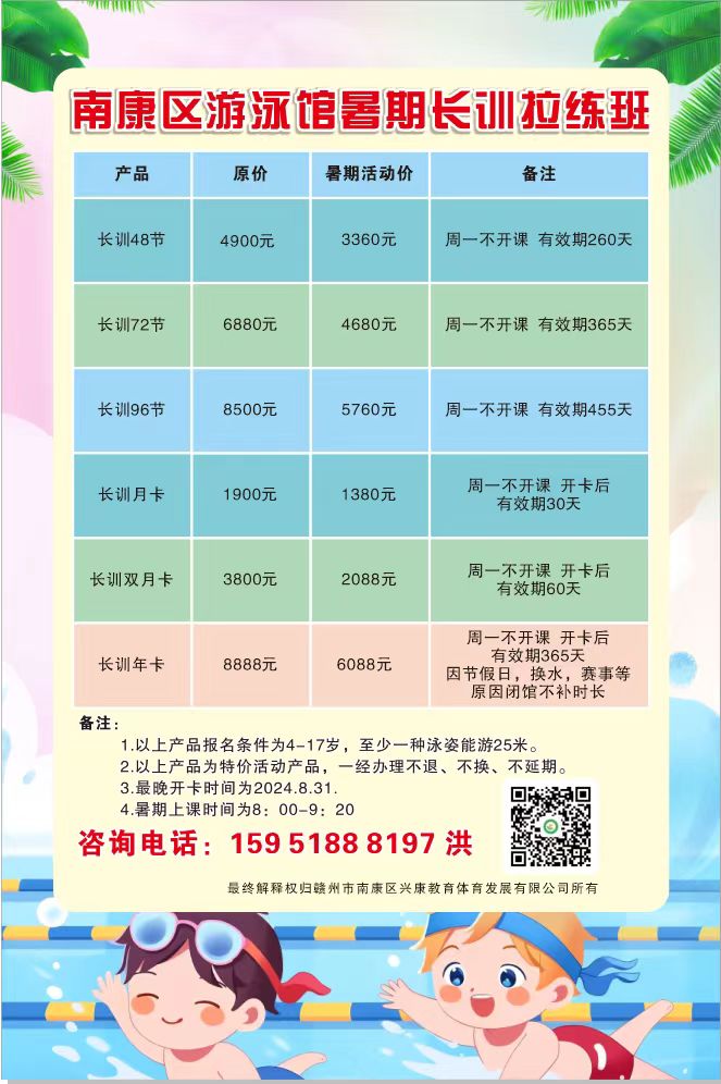 1.以上产品报名条件为4-17岁,至少一种泳姿能游25米。